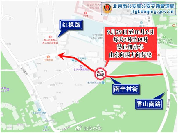 9月29日至10月6日,每天7时至19时,南辛村街(红枫路至香山南路段)禁止机动车由东向西方向行驶。
