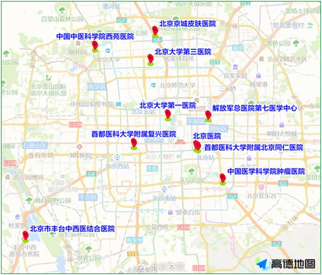 近期过敏、鼻咽炎等季节性疾病多发,前往医院情况较多,预计工作日早高峰至上午时段,复兴医院、北医三院、北京医院、西苑医院、同仁医院、儿童医院等周边道路和桥区节点将出现车流集中的情况,高峰时段为上午7—11时。
