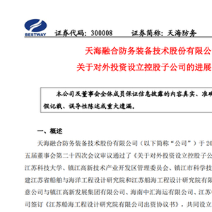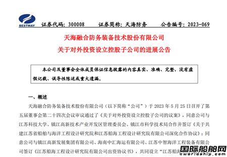 9月28日,天海防务发布公告,公司于2023年5月25日召开董事会审议通过了对外投资设立控股子公司的议案,同意公司与江苏科技大学、镇江高新技术产业开发区管理委员会、镇江市科学技术局合作并签订《关于共建江苏省船舶与海洋工程设计研究院和江苏船海工程设计研究院有限公司深化合作协议》;同意公司与镇江高新发展集团有限公司、海南中汇海运有限公司、江苏中智海洋工程装备有限公司签订《江苏船海工程设计研究院有限公司出资协议书》,共同设立“江苏船海工程设计研究院有限公司”(暂定名),注册资本为 10,000 万元人民币,其中,天海防务以自有资金出资对外投资设立控股子公司的公告》。