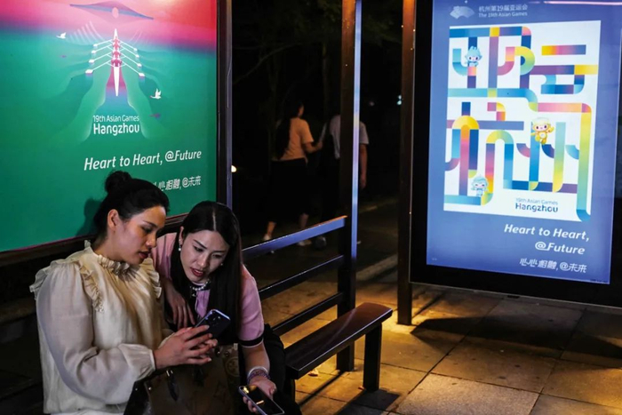 2023年9月7日,亚运会举办前夕的杭州,公交车站满是亚运元素。(图/视觉中国)