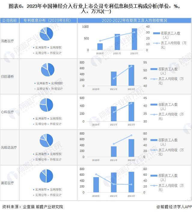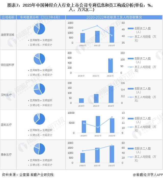 从神经介入行业上市企业已有公开信息分析,专利信息相对较多的企业是微创脑科学,其中发明专利130条;2022年,员工总数最多的则是蓝帆医疗,员工总数为7373人;员工人均创收最高的为微创脑科学,人均创收达106.46万元。