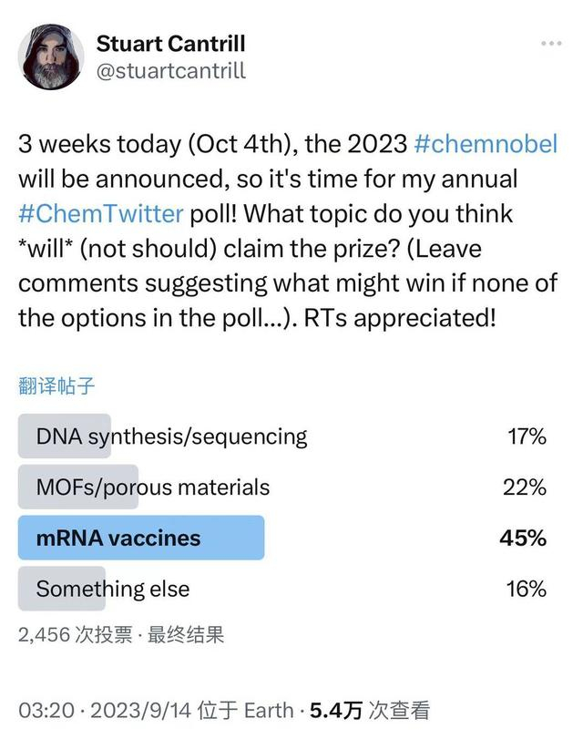 《自然》物理和化学期刊编辑主任斯图尔特·坎特里尔 (Stuart Cantrill) 发起的针对诺贝尔化学奖的推特民意调查显示,mRNA 疫苗获得了55% 的选票。超过 22%的人投票支持 MOF多孔材料,而 17%的人投票支持 DNA 合成测序。