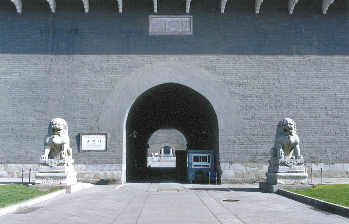 明代所建正阳门建筑群包括城楼、箭楼、瓮城、东西闸楼及关帝庙和观音庙。瓮城中间是十字道通往东南西北四个门,原本四门都没有放置石狮。清末,京奉、京汉两条铁路线在正阳门设火车站,周边人流、车流非常密集。1914年,为缓解交通拥堵,内务总长朱启钤向大总统袁世凯提交《修改京师前三门城垣工程呈》,并亲自主持改建工程。1915年6月16日开工,拆除瓮城东西闸楼及城墙,城门楼城墙两侧各开两座门洞沟通南北马路;箭楼北侧增加了月台和之字形台阶,并用了欧式风格装饰。