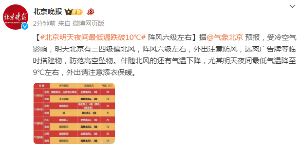 北京明天夜间最低温跌破10℃,阵风六级左右