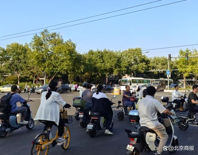 下午4时许,东四北大街和东四十条相交十字路口,人车穿梭繁忙。随着直行红灯亮起,从南至北的非机动车道上,等候的骑行者渐多,不一会儿就汇集了近20位。经过记者点数,佩戴头盔的电动车骑行者仅6位,占比约三分之一。