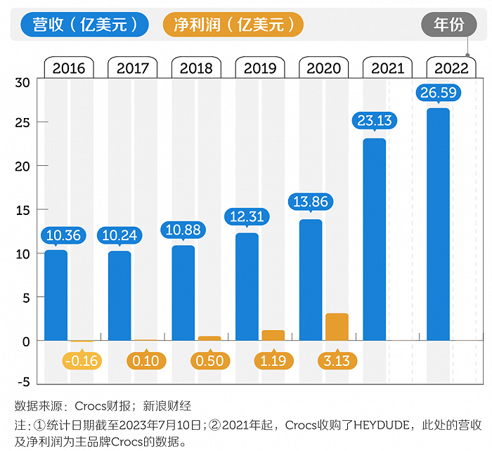 随后,Crocs为了挖掘增长点,陆续与ChristopherKane、KFC、王者荣耀等品牌联名,还邀请杨幂、周雨彤、白敬亭等明星代言。热度带来的价值体现在财报上,从2017 - 2022年,Crocs的营收翻了接近两倍,达到26.59 亿美元,净利润也逐年攀升,2022年增加到5.4亿美元。