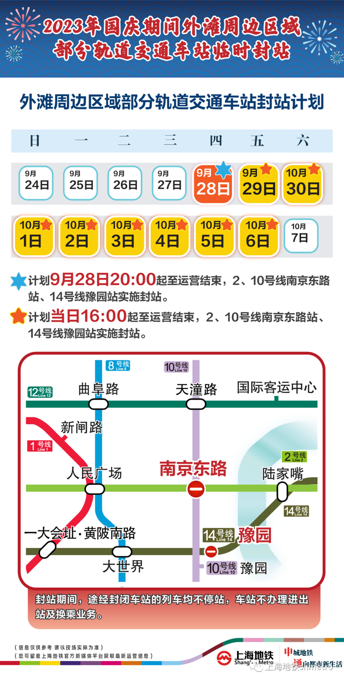 此外,9月28日20:00至运营结束,以及9月29日至10月6日的每日16:00至运营结束,地铁2、10号线南京东路站,14号线豫园站计划实施封站跳停。