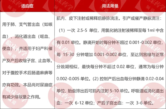 ▍作用机理:垂体后叶素含有缩宫素、加压素。加压素可直接兴奋血管平滑肌,使肺小动脉、毛细血管收缩,减少肺循环血流量,降低肺循环压力,利于血管破裂处血栓形成而发挥止血作用[2]。
