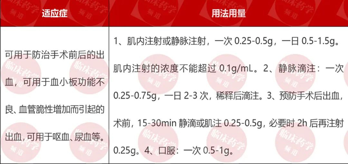 ▍适应症:适用于因毛细血管损伤及通透性增加所致的出血,如鼻衄、视网膜出血、咯血、胃肠出血、血尿、痔疮及子宫出血等。也用于血小板减少性紫癜,但止血效果不十分理想。