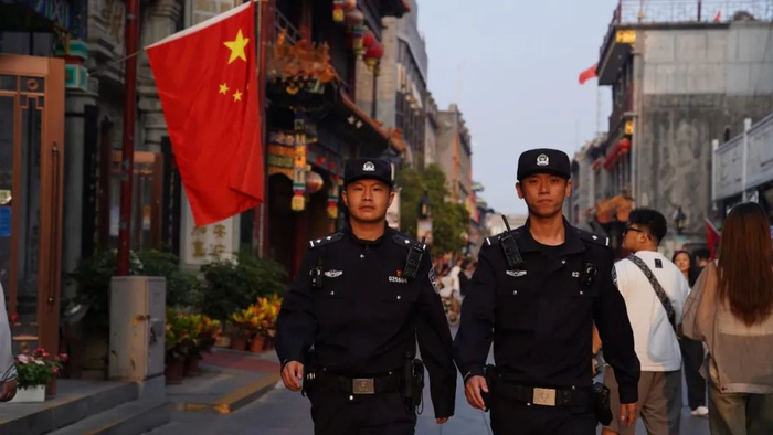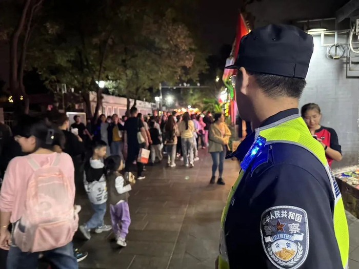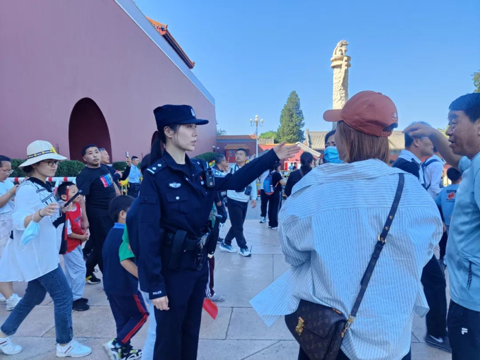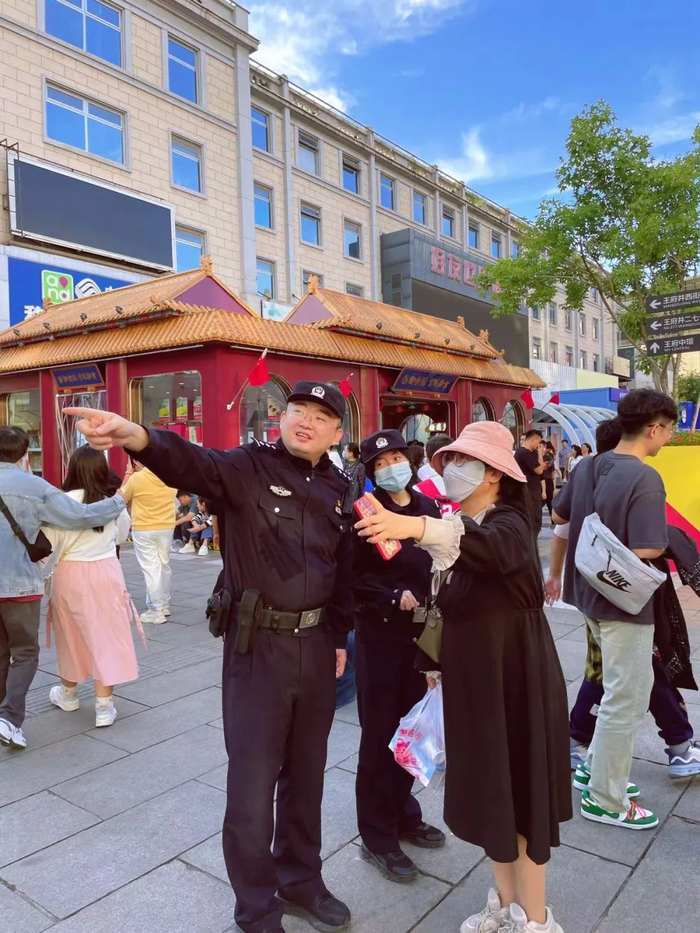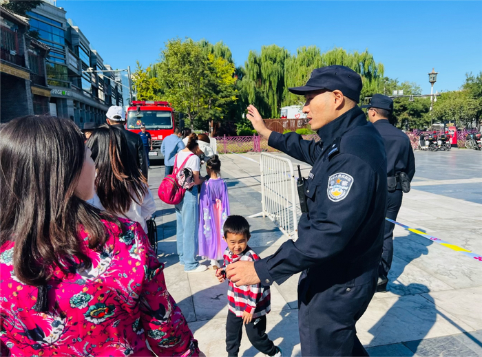朝阳分局民警在辖区开展秩序维护工作,为群众游客提供安全稳定的出游环境。
