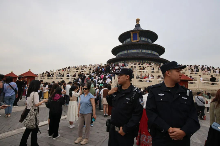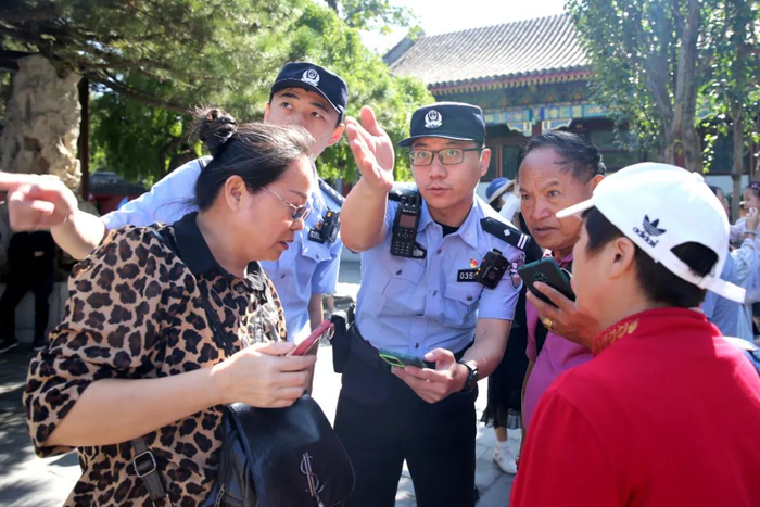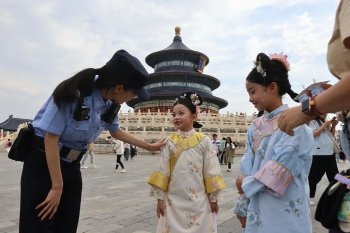 东城分局民警在天坛景区开展秩序维护工作,疏导人流,用温馨真诚的服务,为游人留下关于“平安”的记忆。