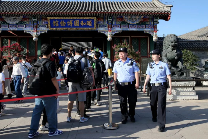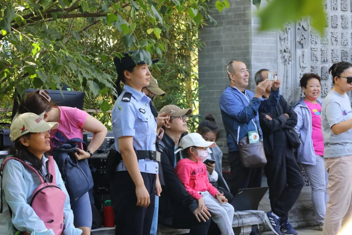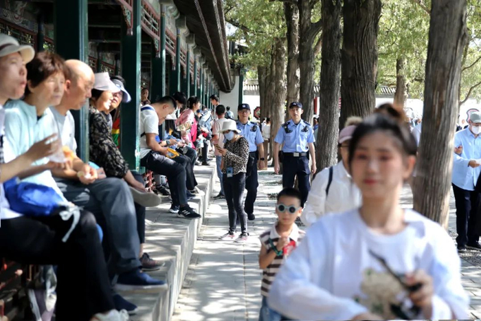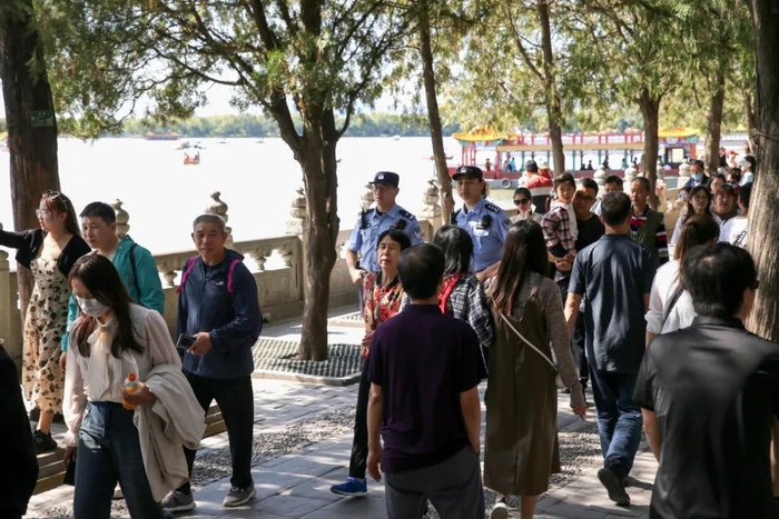 海淀分局民警在颐和园进行治安秩序维护工作,对游客密集点位,提高巡控密度和频次,对地势狭窄、人流聚集的场所开展定点防控,增强巡逻力量,及时为群众提供帮助。