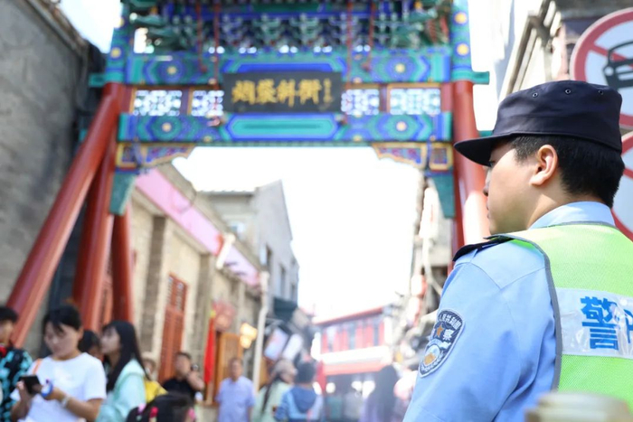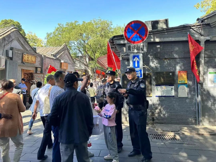 东城分局民警在南锣鼓巷开展巡逻安防工作,帮助人们指路、寻回失物、寻找走失同伴,维护现场秩序。