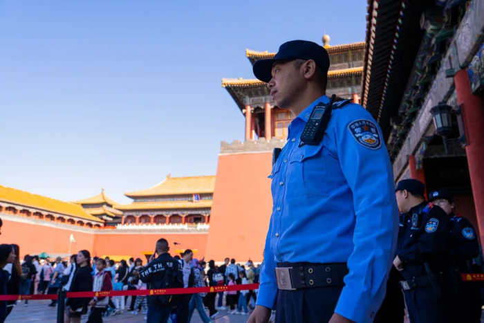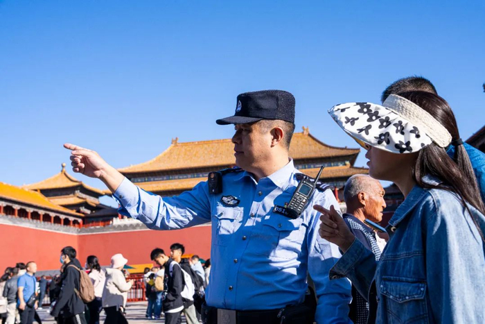 故宫派出所民警在景区进行巡逻值守,维护现场秩序,为来往游客提供道路指引。