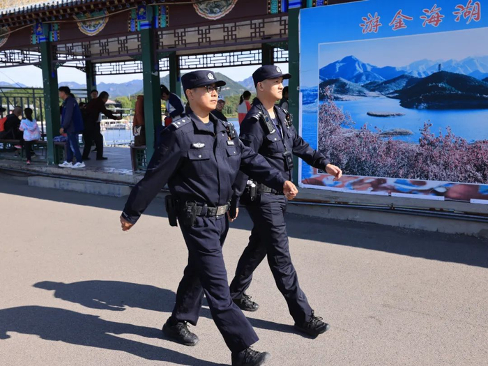 平谷分局民警在金海湖园区进行动态巡逻任务,时刻关注周边环境、人群情况,排查安全隐患,及时向群众提供指引、寻物、寻人、紧急救助等服务。