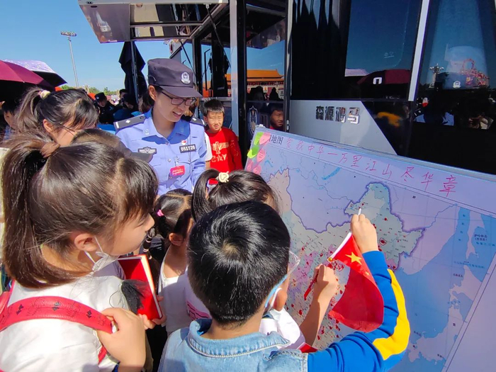 天安门分局民警国庆期间依托便民服务车,为过往游客提供休息点和服务站,为需要帮助的群众提供帮助;设置留言地图板,便于来往游客在此打卡留言。