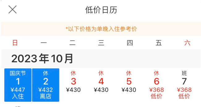 杭州富邦丽佳国际大酒店10月1日入住的最低价格也不满500元/晚,为447元/晚;10月2日后的最低入住价格均为430元/晚左右。