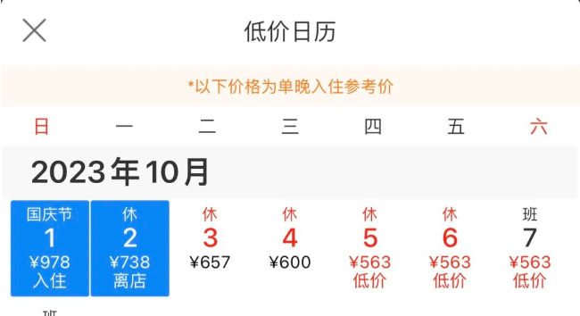 记者搜索发现,如中秋国庆假期期间,北京长城饭店10月3日入住的最低价格为657元/晚,10月4日600元/晚,10月5日后价格为563元/晚。