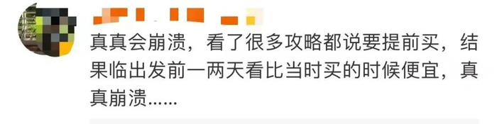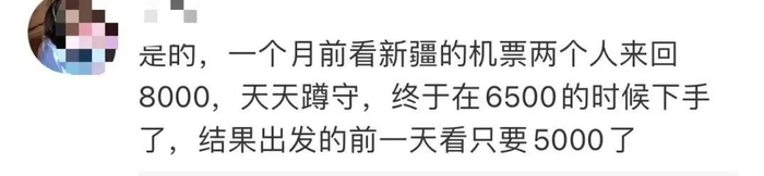 “我和朋友计划国庆期间去新疆旅游,想着提前预订会便宜,8月底就买了深圳-乌鲁木齐的三张机票,2565元一张,今天一查,一张机票只要1736元,三张票加起来差价高达2487元,亏了近一半!”社交平台上有网友吐槽道,“属于还没出门就把钱亏完了。”