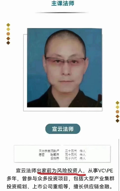 在上会与上市之间,出世的“哲”人选择了上香。宣云法师出家前为风险投资人,从事VC/PE多年,曾参与众多投资项目,包括大型产业集群投资规划、上市公司重组等,擅长供应链金融。而今,舍业出家,在杭州临安城北的千年古刹千佛寺--南天目山玉皇坪。