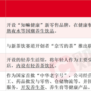 据介绍,好想你开设的轻养生活馆,将年轻人作为主要受众群体,是积极切入年轻人消费场景开设的新一代门店,内设有轻养茶饮区。另外,浙江震元作为国家首批“中华老字号”,也在积极拓展养生调理等健康服务,开发养生茶、养生膏等健康产品。