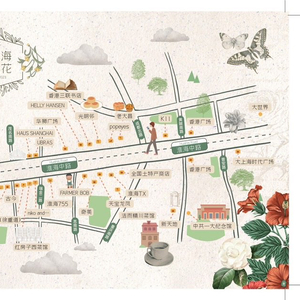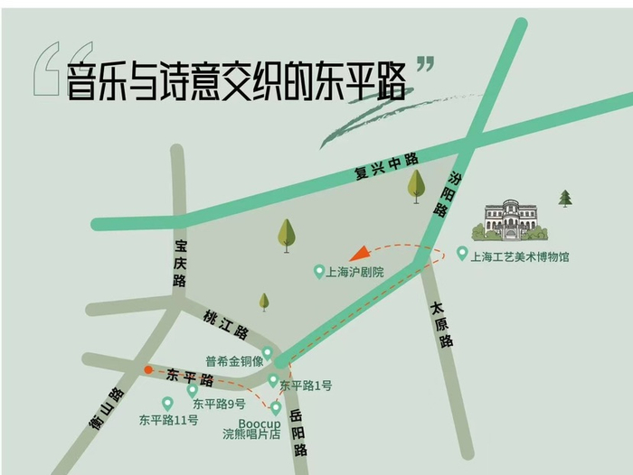 路线:东平路11号→东平路9号→东平路1号→BOOCUP浣熊唱片店→普希金广场→上海工艺美术博物馆→上海沪剧院