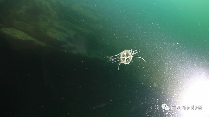 都安瑶族自治县潜水导游 韦乐:潜伴拍摄水母他以为只有一个,然后他打开那个摄影灯的时候照亮了,我的周身全部是好多桃花水母,就像我们看《阿凡达》那个男主角和女主角在树上走的时候碰到那个花,那个植物它飞起来在周身特别漂亮。桃花水母对水质的要求比较苛刻,一个是水温,二个是水质,然后还有看天气。