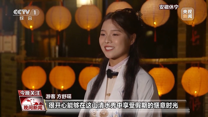 在安徽黄山休宁县的齐云山下横江水畔,游客提着鱼灯穿街走巷,风雅徽州集里亮起了点点星光,仿佛徽州闹市风貌重现。