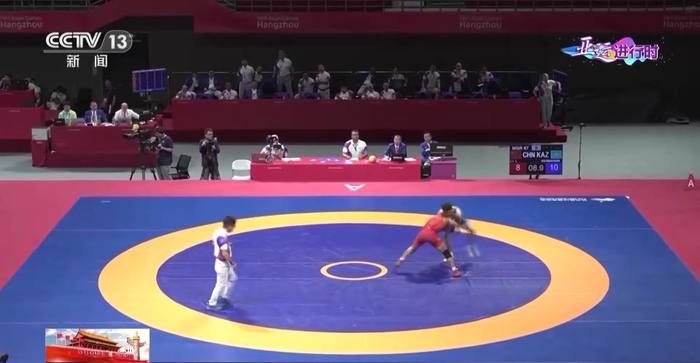 如此富有力量的比赛,需要怎样的场地来承载呢?摔跤必须使用国际摔联认可的摔跤垫,垫上有直径9米的圆圈,比赛区域外围绕着同样厚度的1.5米保护区。9月28日,临安体育文化会展中心体育馆结束了跆拳道项目的比赛后,场馆运行团队就迅速进入到转场工作中。除了地垫、计时记分设备等器材需要更换,体育展示、转播设备、运行流线等等方面也都需要调整。仅用三天,这座场馆摇身一变,成为我们现在看到的摔跤比赛擂台。