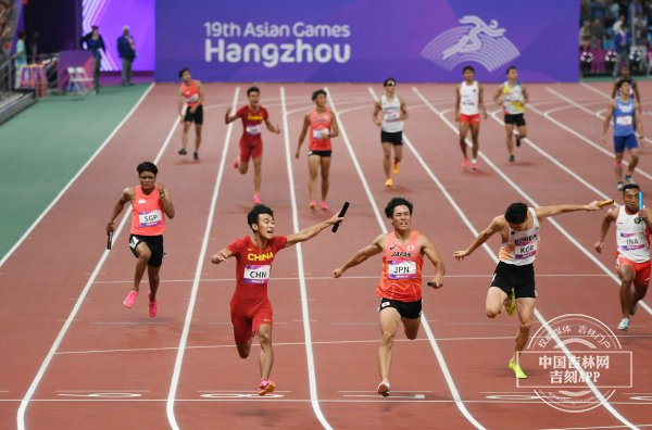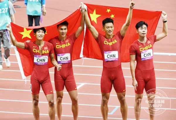 小哪吒造型的第四棒选手葛曼棋冲向终点线,中国队斩获女子4x100米金牌。20分钟后,第四棒选手陈佳鹏绝地反击,中国队以38.29秒的成绩刷新亚运会男子4x100米纪录,再夺金牌。