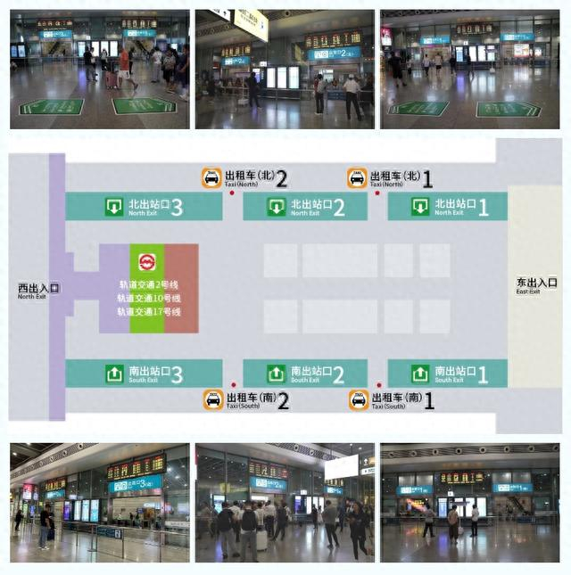 从南出站口2、南出站口3、北出站口2、北出站口3出来的旅客,可选择在虹桥火车站站乘坐轨道交通2号线、10号线、17号线。