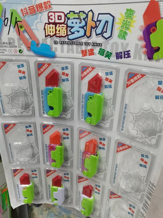 五年级的颢颢,目标是集齐市面上所有萝卜刀。刚放学,他就攥着两块钱,直奔小卖部新出的指尖萝卜刀前。他已经拥有十多把萝卜刀,甚至还摔坏了两个。买得多了,他有了经验,“上面有印花的比较容易坏”。不过,也有网友称,“印花才是正版的标志。”