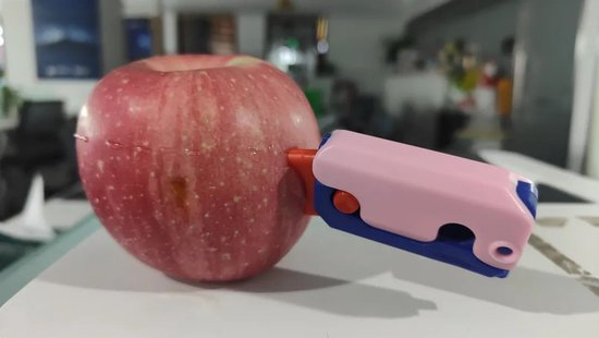 这是一款塑料仿刀玩具,外形有几分神似胡萝卜。配色主打多巴胺风,不少款式还复刻了《变形金刚》萨克巨人的颜色。因玩法借助自身重力实现滑动,又名重力小刀。在速度加持下,只听“啪嗒”清脆响几声,即可快速出刀收刀。刺在人身上,与筷子尖戳人的感觉相似。