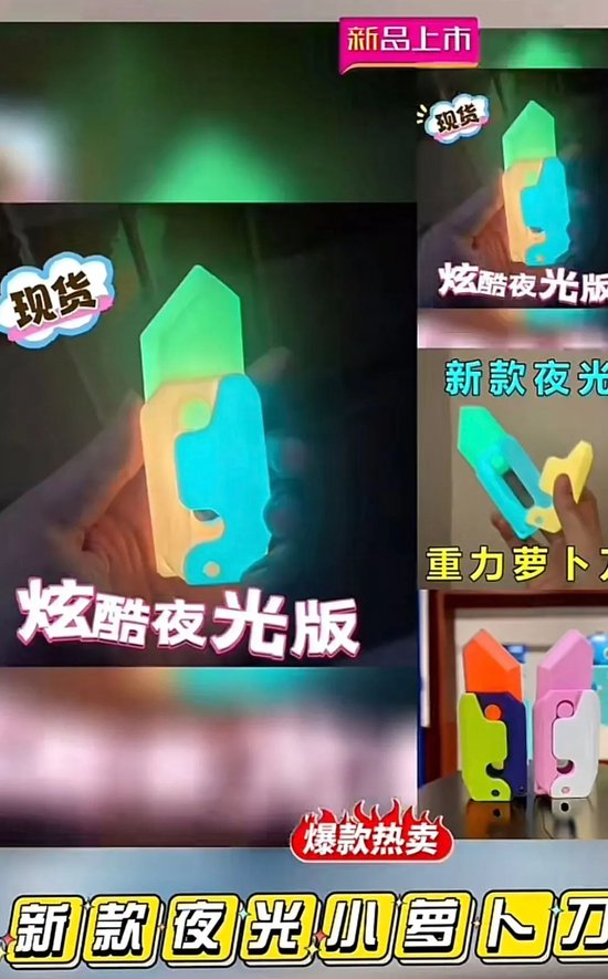 于是,在原始的萝卜刀之后,普普通通的萝卜刀开始进化。功能上,出现了夜光萝卜刀、闪光萝卜刀、萝卜手指、长达40厘米的超大号萝卜刀等。连品种都变了,全网第一把香蕉刀已经有人在玩了。甚至商家还开始精准收割小学生,推出了萝卜刀枪、萝卜刀梳子、玉桂狗图案的萝卜刀等。至于萝卜刀广告语,往往还会加上“解压”“抖音同款”等字眼。