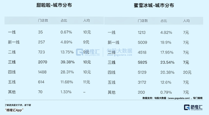 窄门餐眼的数据显示,三线城市在甜啦啦的城市分布中接近百分之四十,三线以下城市在甜啦啦市场中占到了70%,而蜜雪冰城的三线及以下城市在所有门店中只占到了不到一半。