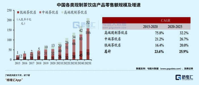 尽管茶饮市场规模逐渐增长,但是高端茶饮店的增长已经显著放缓,而中端茶饮店规模仍旧保持高速增长。
