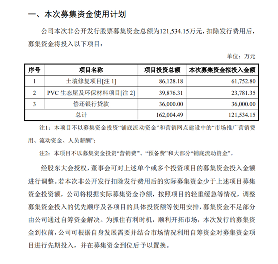 近些年,鸿达兴业的定增是在2017年9月,当时预计募资12.15亿元,但是结果实际募资的净额是11.81亿元,没有达到预期募资数。而当时募资的钱,是用来建设“土壤修复项目”、“PVC生态屋及环保材料项目”和“年产30万吨聚氯乙烯及配套项目”三大项目。
