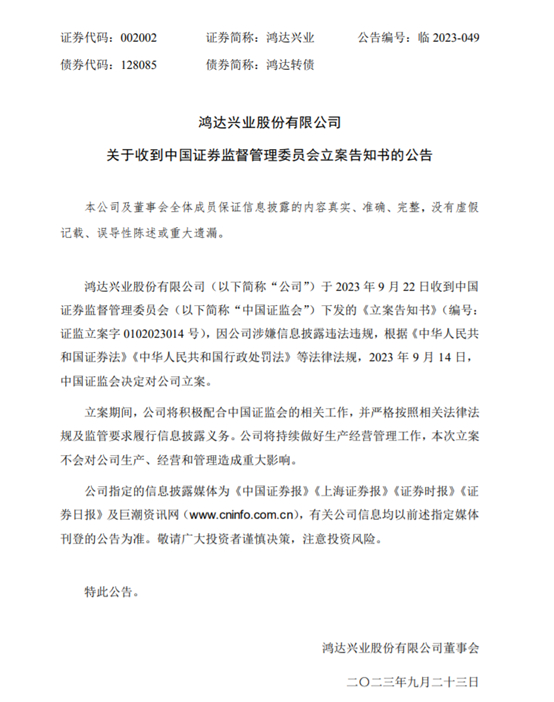 9月23日,鸿达兴业发布公告,公司涉嫌信息披露违法违规,在9月13日被证监会立案。对于此次被立案调查,鸿达兴业表示,公司积极配合证监会的工作,严格按照相关法律法规级监管要求披露信息,公司将持续做好生产管理工作,并且,此次立案对于公司的经营管理影响不大。