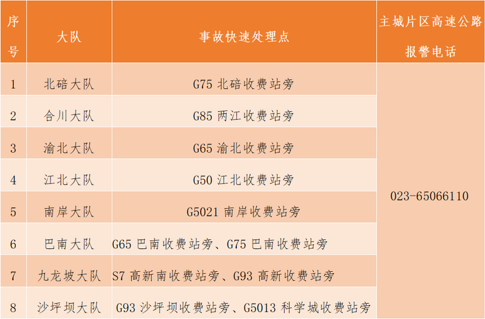 G65巴南收费站、G65渝北收费站、G85两江收费站、G75北碚收费站、G5013科学城收费站。