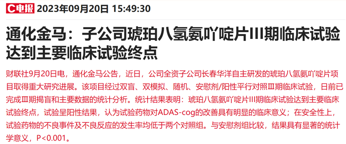 A股上市公司通化金马9月20日盘后公告披露治疗阿尔茨海默病新药琥珀八氢氨吖啶片III期临床试验揭盲结果。统计结果表明,琥珀八氢氨吖啶片III期临床试验达到主要临床试验终点,试验呈阳性结果,认为试验药物对ADAS-cog的改善具有明显的临床意义;在安全性上,试验药物的不良事件及不良反应的发生率均低于两个对照组。与安慰剂组比较,结果具有显著的统计学意义,P<0.001。