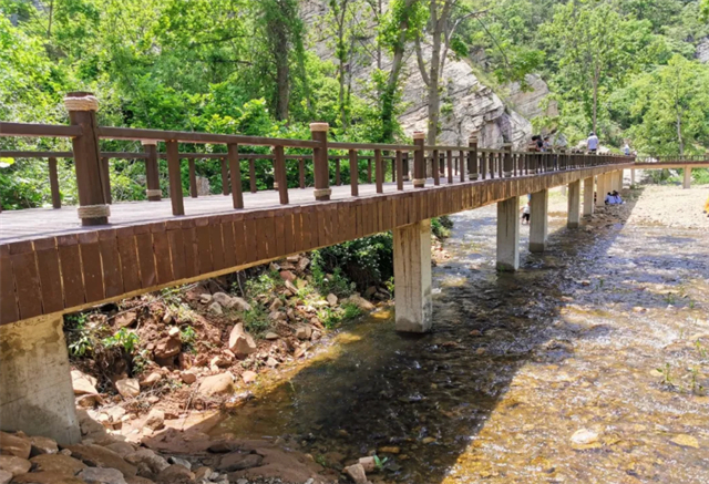 一条曲折蜿蜒的小溪贯穿南北,流水在乱石之间激荡,堤坝处有小型的瀑布,潺潺溪流声,宛如林间天籁,充盈在静谧的山野。