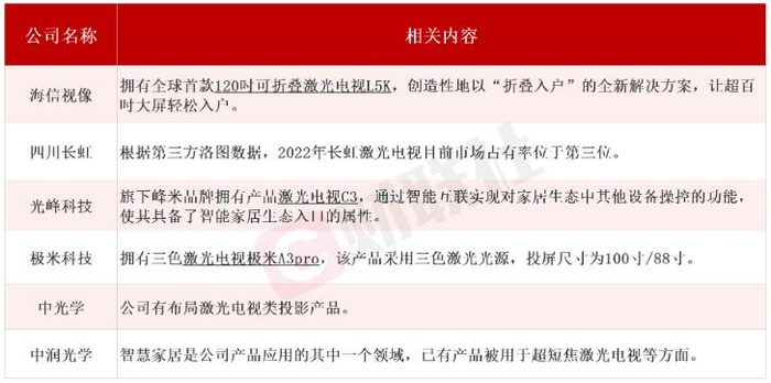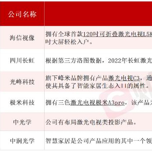 十年间,海信视像积累的激光显示专利数量居细分行业全球前列,截至2023年上半年末,海信视像累计申请国内外激光专利2230件,初步形成了强大专利池和较完整的激光电视产业链。据财联社不完全整理,在激光电视领域有布局相关业务的A股上市公司有海信视像、四川长虹、光峰科技、极米科技、中光学、中润光学等,具体情况如下: