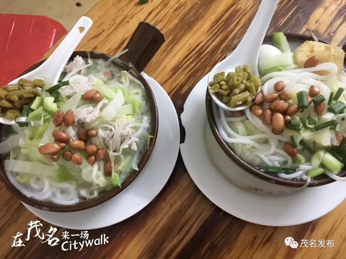 砂煲粉是茂名特有的小吃,因用砂煲来煮而得名,在入夜的茂名街道,随处可见卖砂煲粉的店铺,价廉物美,营养丰富,配菜有小白菜、鹌鹑蛋、鱼丸、香肠等,米粉圆润饱满,爽口弹牙,着实让人垂筵欲滴。
