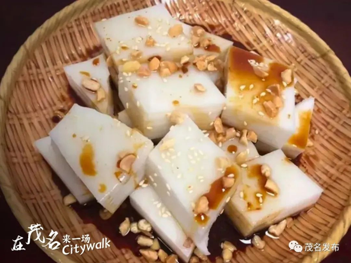 簸箕炊,茂名的传统小吃之一,采用竹篾编制而成的簸箕,为盛具而著称,制作原料和工艺都相当考究,一定要用陈年老米制作,口感才会爽滑弹牙,入口细腻、富有弹性,软滑而不粘牙,放上香油、芝麻与蒜蓉,使其香浓而不腻口。