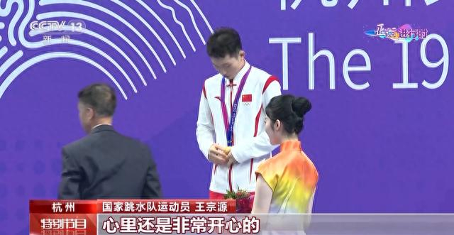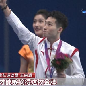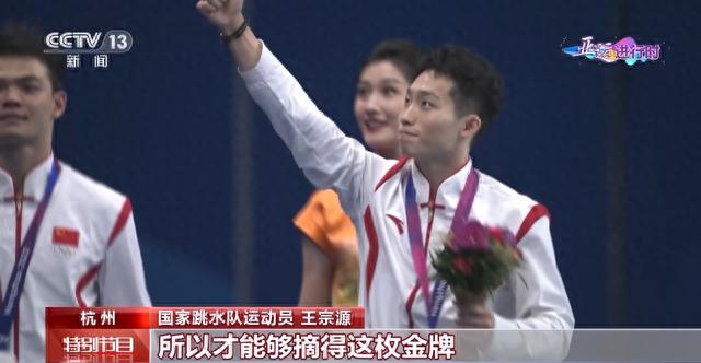国家跳水队运动员 王宗源:整场比赛过程当中其实出现了很多问题,特别是心态上的,很明显在几个自己很拿手的动作出现了一些问题,所以导致了整场比赛只能说给自己打个五六分。最后一跳是自己立刻调动了回来,找到了自己该有的比赛节奏,所以最后一跳自己能“咬住”,才能够摘得这枚金牌。