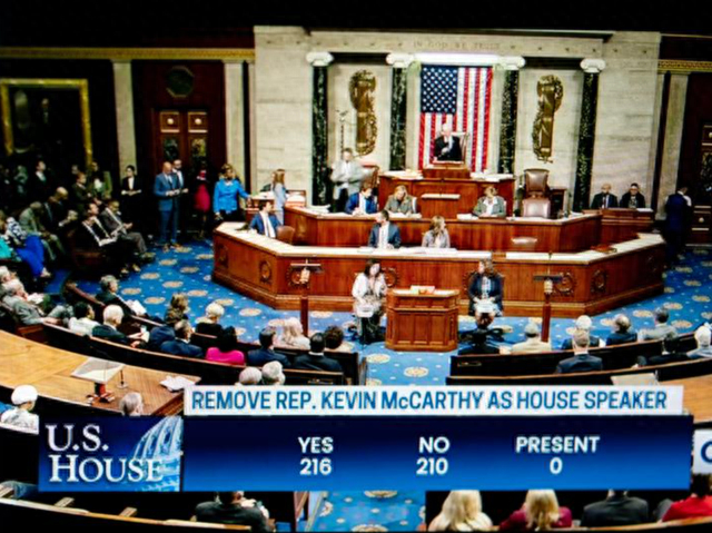 当地时间10月3日,美国众议院以216票赞成、210票反对的结果通过动议,罢免议长凯文·麦卡锡。