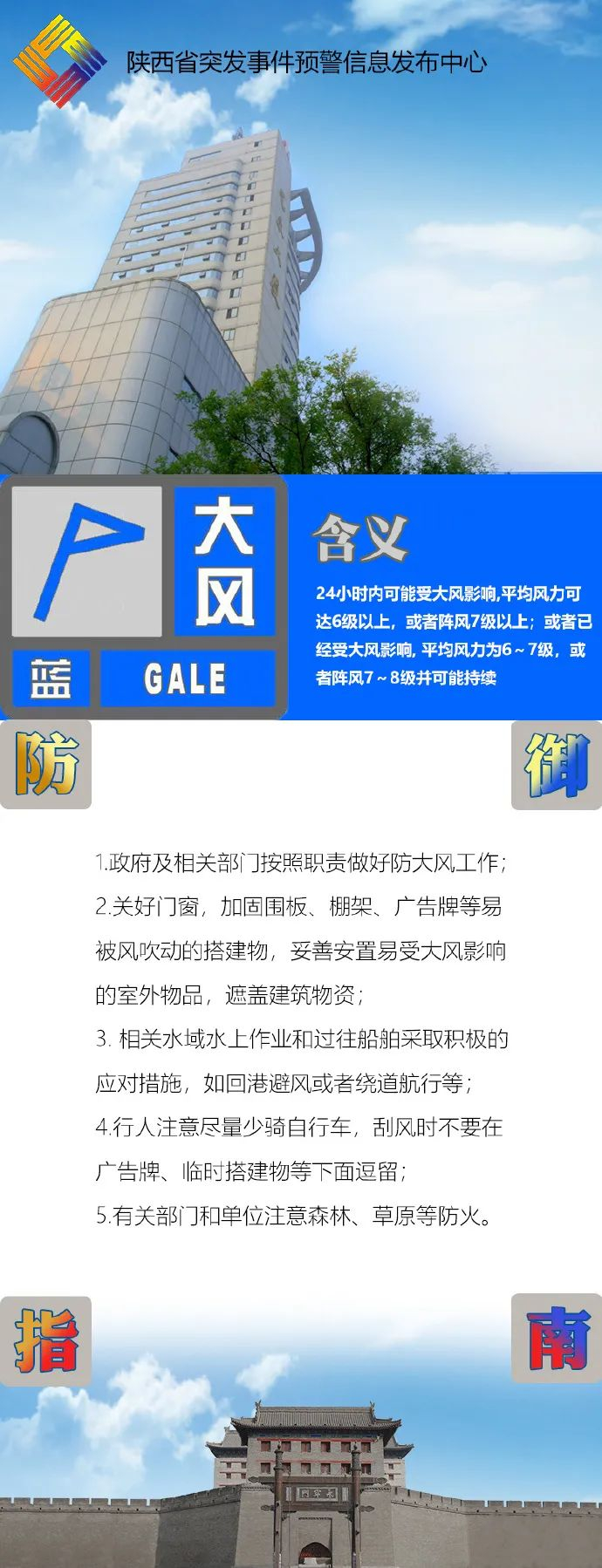 陕西省气象台2023年10月05日12时53分发布大风蓝色预警信号:目前延安市南部县区、宝鸡市东部县区、咸阳市部分县区、渭南市北部县区已出现6~8级大风,预计下述地区未来24小时内将受大风影响,平均风力可达4-5级(阵风6级以上):西安市未央区、新城区、碑林区、莲湖区、灞桥区、雁塔区、阎良区、临潼区、长安区、高陵区、鄠邑区、西咸新区、蓝田县、周至县,宝鸡市陈仓区、凤翔区、岐山县、扶风县、眉县、陇县、千阳县、麟游县、太白县,咸阳市渭城区、秦都区、兴平市、彬州市、三原县、泾阳县、乾县、礼泉县、永寿县、长武县、旬邑县、淳化县、武功县,铜川市王益区、印台区、耀州区、宜君县,渭南市临渭区、华州区、华阴市、韩城市、大荔县、蒲城县、澄城县、白水县、合阳县、富平县、潼关县,延安市富县、洛川县、宜川县、黄龙县、黄陵县,汉中市汉台区、南郑区、城固县、洋县、西乡县、勉县、宁强县、略阳县、镇巴县、留坝县、佛坪县,安康市汉滨区、旬阳市、汉阴县、石泉县、平利县,商洛市商州区、洛南县,杨凌示范区杨陵区,请注意防范。