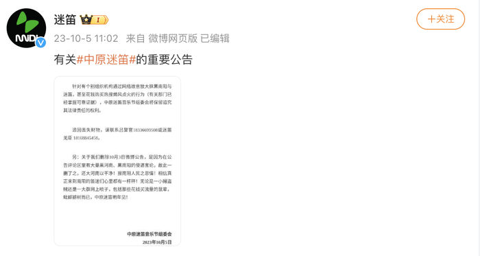 对此,南阳市融媒体中心10月5日发布关于2023中原迷笛音乐节有关情况的通报: