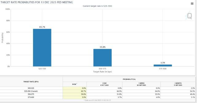 截至10月5日周四美股午盘,期货交易员押注美联储在11月加息的概率不足22%,显著低于一个月前预期的42%,推迟到12月加息的概率徘徊31%,即年内不再加息为预期主流。