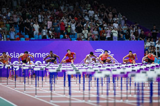 2023年10月2日,杭州亚运会田径项目男子110米栏决赛在杭州奥体中心体育场举行,中国选手徐卓一获得季军。 这是徐卓一(左四)在比赛时。